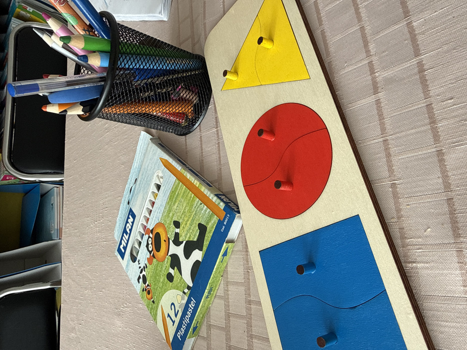 The scene depicts a tabletop arrangement of educational and art supplies within a room in Ignatievo, Bulgaria. The table surface is covered with a light beige or pinkish textured fabric, possibly a tablecloth. In the foreground, a rectangular wooden puzzle board features three distinct recessed geometric shapes: a blue square, a red circle, and a yellow triangle. Each shape is divided into two segments by wavy or straight lines and contains two small, cylindrical wooden pegs. To the right of the puzzle board, a black mesh cup functions as a holder for various writing and drawing tools, including numerous colored pencils, a blue ballpoint pen, and a blue eraser. Positioned behind the puzzle board and to its left, a white and blue cardboard box labeled "MILAN 12 Plastipastel" with a cartoon cow illustration is visible, likely containing crayons. In the background, a portion of a black chair with a chrome frame is visible, along with shelves containing folders or books, indicating an indoor setting like a classroom or study area. No individuals are present, and no actions are actively occurring.
