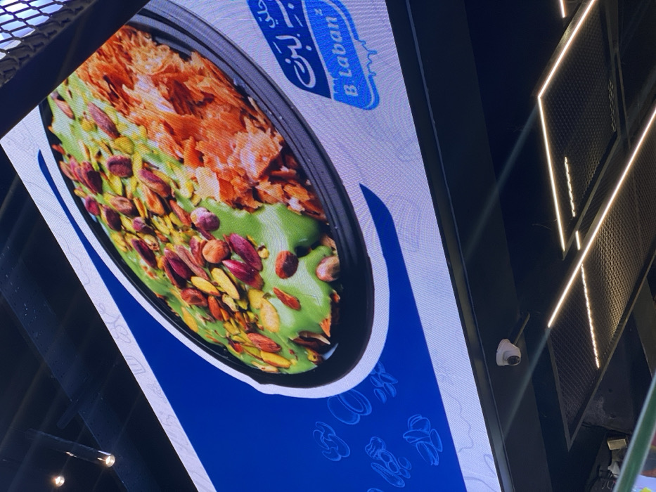 This image depicts a large, illuminated digital display advertising a dessert item, positioned within an indoor commercial setting in the Sarouja Municipality, Syria