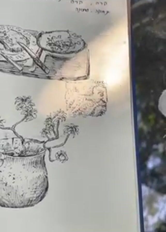 The video begins with a close-up of a sketchpad featuring a drawing of food on a platter, a small potted plant, and other sketches. The writing in the sketchpad is in Hebrew. The camera pans down, showing the environment in which the sketchpad is situated. The outdoor setting is a garden-like area with rough stone pathways, trees, and stone sculptures, including a partial bust of a man. The lighting suggests a bright, sunny day.