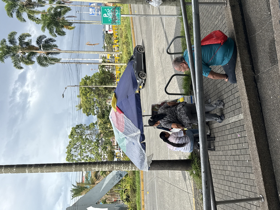 The scene depicts an urban roadside in Perimetro Urbano Pereira, Colombia, under an overcast sky with heavy grey clouds. In the immediate foreground, a metal handrail with two horizontal bars extends across the lower portion of the image. Below the handrail, a concrete ledge is visible. On this ledge, to the right, a man with light skin, short grey hair, and a beard is seated, facing right. He wears a teal short-sleeved shirt and dark trousers. A red drawstring bag rests behind him on the ledge. The midground features a grey paved sidewalk with rectangular pavers. A tall, dark utility pole stands prominently on the left side of the sidewalk. Attached to or positioned beside this pole is a large, multi-colored vendor umbrella, featuring sections of light blue, white, red, yellow, and dark blue fabric, with a clear plastic sheet draped over a portion. Beneath the umbrella, two women are present. One woman, with dark hair styled in a long ponytail, is seated on a small black stool, facing away from the camera and slightly to the left. She wears a white and light pink striped short-sleeved top and blue jeans. The second woman, with dark hair tied back, stands facing the seated woman, tending to a metal vendor cart containing various items, partially obscured. She wears a patterned short-sleeved shirt and dark trousers. Beyond the sidewalk, a grey asphalt road with double yellow lines runs horizontally. A dark grey two-door compact car is visible on the road, partially obscured by the umbrella, facing left. Further across the road is a grassy median with yellow guardrails. A green square sign, featuring a white 'P' and a bicycle symbol, is mounted on a pole to the right of the road, showing visible graffiti. The background is dominated by lush green vegetation. Tall palm trees with slender trunks and fronds are prominent, interspersed with other green trees and bushes. To the far left, a large, angular grey metal sculpture or structure with visible graffiti (including "HP") stands in a grassy area. Overhead utility lines crisscross the sky. Distant buildings and structures are faintly discernible through the trees. A dark street light pole is also visible in the mid-background.