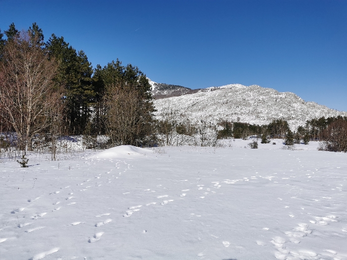 The image depicts a winter landscape in Mali Bostur, Montenegro. The foreground presents an expansive, snow-covered field marked by numerous animal tracks. A small evergreen sapling is visible on the left side of the field, with a low snowdrift or mound further back. The midground consists of a dense band of mixed trees, including bare deciduous trees and dark green coniferous trees, separating the field from the background. The background features a large mountain range, heavily covered in snow and ice, with visible rocky outcrops and sparse vegetation. The sky is clear and bright blue, with a faint contrail visible in the upper right quadrant. No human subjects or discernible actions are present; the scene is illuminated by natural daylight.