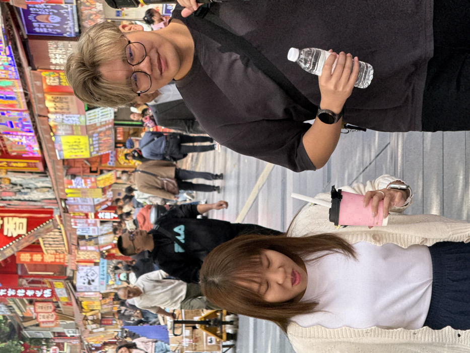 The image displays a bustling pedestrian street scene in Yuzhong District, China, characterized by numerous people and vibrant commercial activity. In the immediate foreground on the left, a young East Asian female, with brown hair and bangs, wears a white t-shirt, an off-white scalloped-edge cardigan, and a dark blue pleated skirt. She holds a pink beverage cup with a black lid and white straw in her right hand, her head tilted slightly downward, appearing focused on the drink. A white smartwatch is visible on her left wrist. To her right, a young East Asian male with light brown hair and glasses wears a dark grey t-shirt and black pants. He holds a clear plastic water bottle in his left hand and a black smartwatch is on his left wrist. A black strap, possibly from a bag or camera, crosses his body. He is looking directly at the viewer with a slight smile. The midground and background are densely populated with a diverse crowd of pedestrians walking in various directions on a paved surface. Notable figures include a male wearing a black hoodie with the "FILA" logo and glasses, and another male pushing a metal handcart loaded with cardboard boxes. The street is lined with numerous multi-story buildings housing shops or stalls, featuring traditional Chinese architectural elements and an abundance of brightly lit signage. These signs, displaying Chinese characters in red, yellow, blue, and purple neon or LED lights, extend along the street, contributing to a colorful and lively atmosphere.