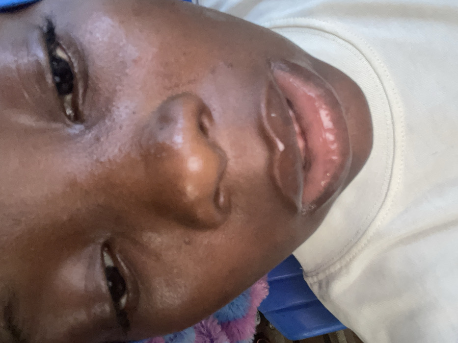 The image displays a close-up, high-angle portrait of an individual with dark skin, focusing on their face from the nose to the upper chest