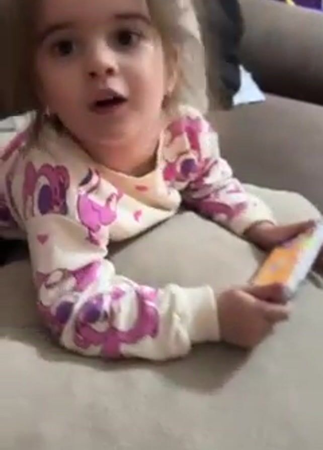 A young child with light brown hair, wearing a white sweater patterned with pink bears, is lying on a beige couch. The child holds a cell phone in their right hand and smiles. A colorful play tent is partially visible in the background.