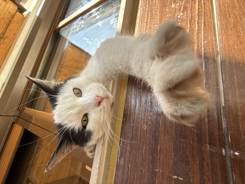 - "A bicolored cat, primarily white with distinct black markings on its ears and forehead, is depicted in a low-angle, close-up perspective, positioned at a window in Kyustendil, Bulgaria" by FM-L8M0m1, licensed under CC BY 4.0