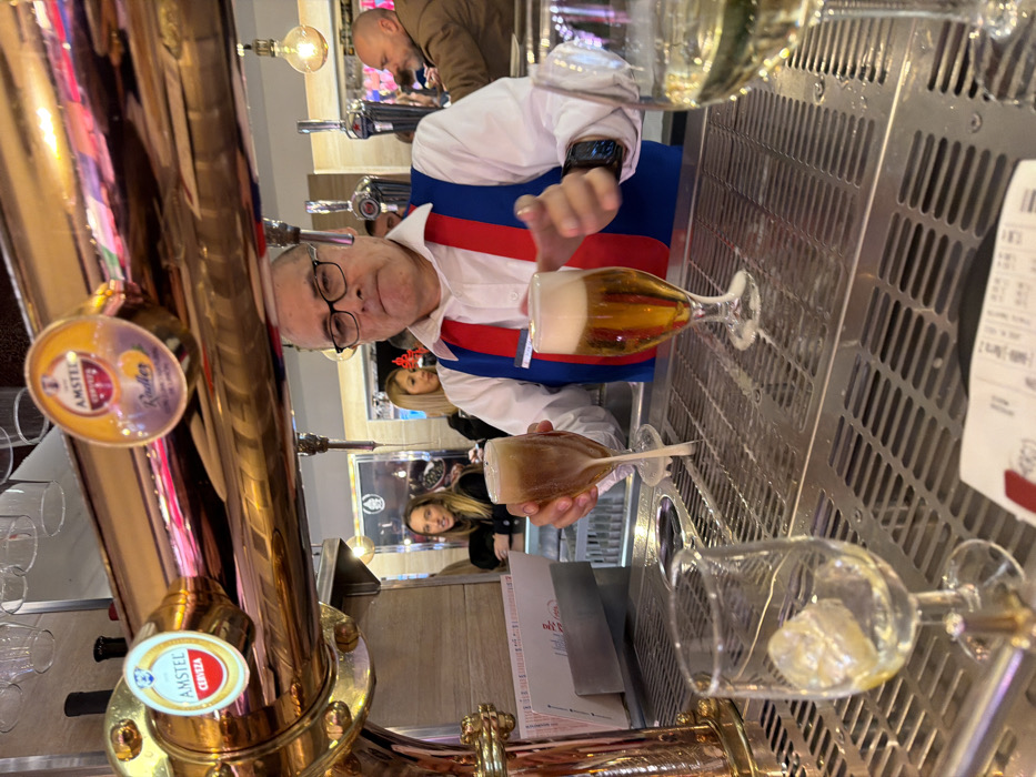 - "A male bartender, approximately 50-70 years old, with glasses, a white collared shirt, and a blue vest with red suspenders, stands centered behind a stainless steel bar counter, holding two stemmed beer glasses" by FM-mVZIs1, licensed under CC BY 4.0
