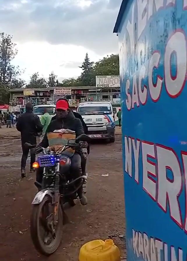 The video depicts a bustling outdoor setting in Kenya. The foreground showcases a motorcycle with two people on it, one wearing a red cap, driving away from the camera, alongside a man walking in the same direction. To the right, there is a blue painted structure with the words "KENA SACCO NYERI KARATINA" printed in white and red, obscured by the camera's position. Two yellow jerrycans are positioned at the base of the structure. In the background, multiple vehicles, including vans, are parked. People are visible walking around, and there are commercial establishments in the distance. The ground is a mix of dirt and mud, and the sky is overcast with grey clouds. The overall atmosphere appears to be that of a busy transportation hub or marketplace.
