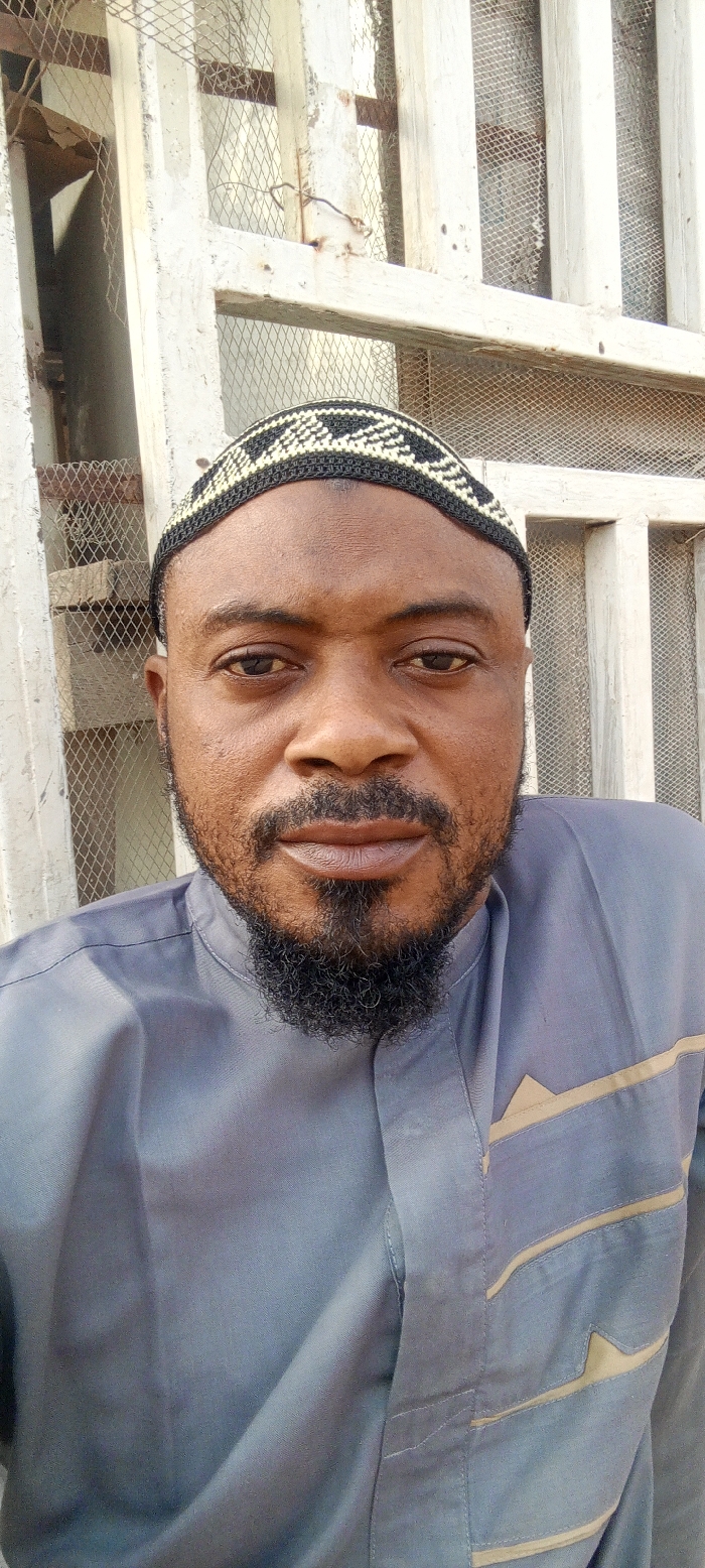 A medium close-up shows a dark-skinned man with a neat, short beard. He wears a black and white patterned cap, and a bluish-grey garment with tan trim. Behind him is a weathered white structure with a wire mesh backing. He looks directly at the viewer with a neutral expression. The lighting is bright and natural.