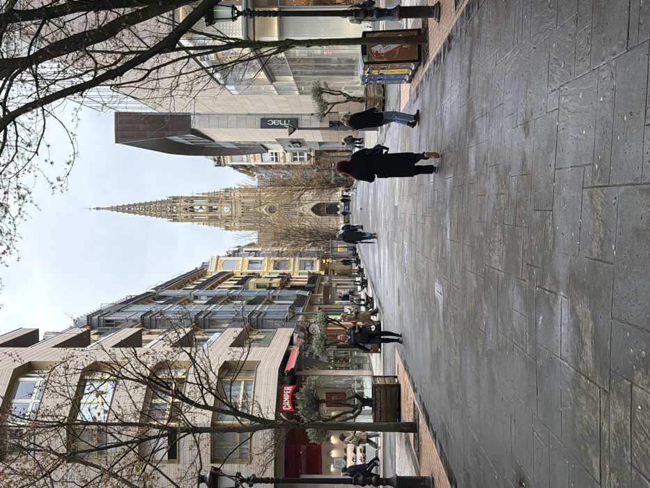 The image displays a pedestrianized street in San Sebastián, Spain, oriented directly towards the Catedral del Buen Pastor, identifiable by its prominent neo-Gothic spire and clock tower in the distant center. The sky is uniformly overcast, and the grey rectangular paving stones of the street exhibit a damp sheen. Multi-story buildings flank both sides of the thoroughfare. On the left, facades vary from modern paneling to traditional with ornate bay windows; a "Camper" shoe store with a red awning is visible at ground level. On the right, a contemporary building with a curved dark upper section houses a "Fnac" store, marked by a vertical sign. Bare deciduous trees and smaller, trimmed olive-like trees in planters line the street. Black, ornate street lamps are positioned along the sidewalks, and public recycling bins (blue, yellow, green) are on the right. Approximately 15-20 individuals are present on the street. In the foreground, a person in a dark coat walks away from the camera, slightly right of center. To their right, another person in jeans and a light jacket stands near the recycling bins. A woman in a dark top and leggings walks towards the camera on the left sidewalk further back. Other pedestrians are scattered along the street, moving in both directions, with one individual appearing to be with a bicycle in the mid-ground. All visible individuals wear casual clothing suitable for cool weather. No explicit interactions between individuals are depicted.