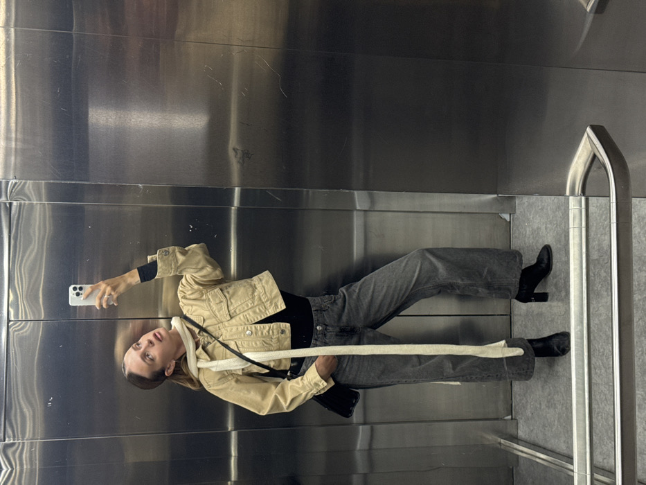 An adult female is depicted taking a mirror selfie inside an elevator. The elevator interior features brushed stainless steel walls with visible scuffs and seams, and a light grey tiled floor. A metal handrail is visible in the lower section of the frame. The woman is positioned centrally, holding a white smartphone in her raised right hand, aiming it towards her reflection for the photograph. She is wearing a light tan cropped denim jacket over a black long-sleeved top, dark grey wide-leg jeans, and black ankle boots with heels. A long, cream-colored knitted scarf hangs around her neck, extending to her mid-thigh. A small black cross-body bag is slung over her left shoulder. Her hair is pulled back, and she is looking upwards and to the right, towards the phone's lens. The specific location within Tbilisi, Georgia, is not discernible from the image.