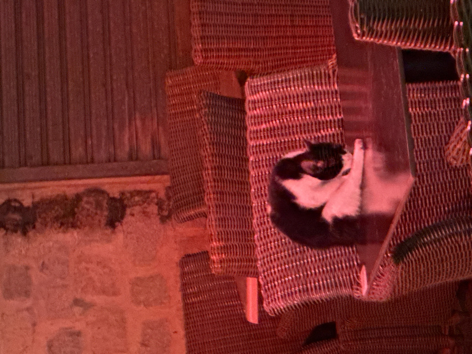 A black and white cat sleeps curled up on a series of stacked woven baskets. The baskets are arranged in a zig-zag pattern. A metal surface, possibly a shelf, rests above the basket where the cat is sleeping. The scene is bathed in a warm, red light, obscuring some details. The left side of the image shows a stone and metal wall.