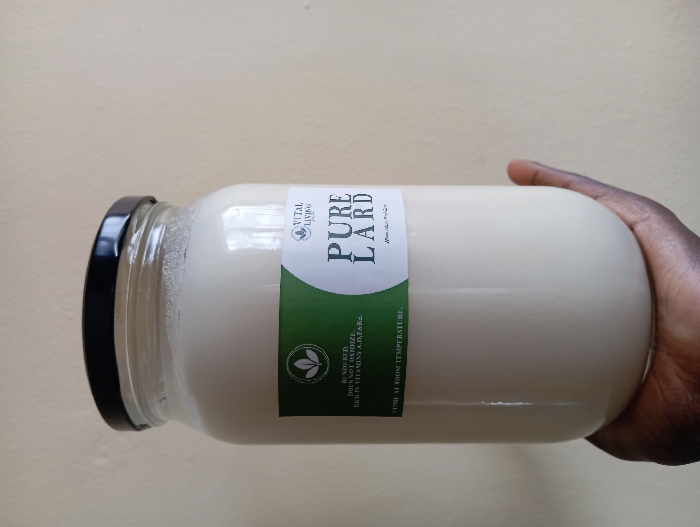 - "The image displays a clear glass jar, approximately one-liter in volume, filled with an opaque, off-white, solidified substance identified by its label as "PURE LARD" by FM-J8Y133, licensed under CC BY 4.0