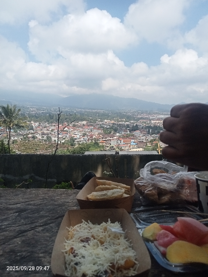 The scene is set in the city of Isiolo east, Kenya, observed from an elevated vantage point. The foreground features a textured, dark gray surface, likely a table or ledge, upon which multiple food items are arranged. These include two oblong, brown paper containers. The one closer to the viewer holds a dish covered in shredded white cheese, possibly over a fried food item. The second container, positioned behind the first, contains several elongated, light brown, fried items, resembling plantain or banana fritters. To the right, a translucent plastic bag filled with various baked goods or pastries is visible. Adjacent to the bag, a portion of a white and black cup is present. A metallic-colored plate holds an assortment of diced fruit, including red, yellow, and lighter-colored pieces. The upper right portion of the image shows a partial view of a dark-skinned hand with clenched fingers, positioned as if resting or holding something out of frame. Beyond the immediate foreground, a low, dark gray concrete wall runs horizontally, acting as a barrier. Below this wall, a dense urban landscape unfolds across hilly terrain. Numerous residential and commercial buildings with varied roof colors, predominantly red and white, are tightly packed. Green vegetation, including trees and cultivated patches, is interspersed throughout the urban sprawl. In the mid-ground, a palm tree is visible on the left. The distant background reveals multiple layers of mountains, partially obscured by a light atmospheric haze. The sky above is largely clear blue, punctuated by scattered white cumulus clouds. The timestamp "2025/09/28 09:47" is embedded in the lower-left corner.