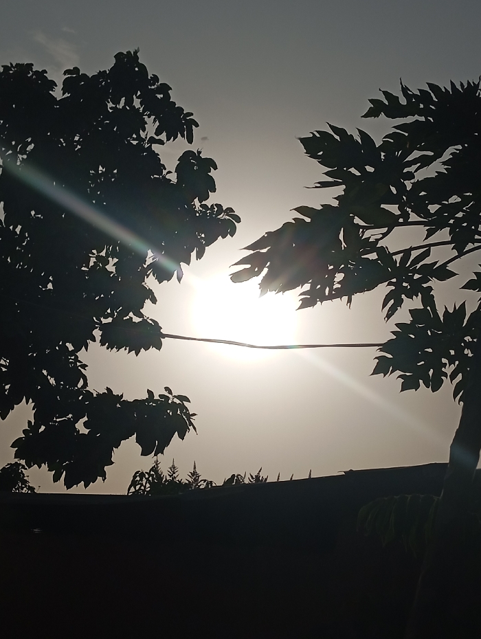 silhouetted scene, likely at dawn or dusk. The sun is a bright, almost blinding point in the center, partially obscured by dark foliage on either side. A horizontal wire runs across the center of the image, seemingly connecting the two tree masses. The bottom portion of the scene is filled with a dark structure, potentially a building or wall, with sparse vegetation silhouetted on top of it. Sunlight streaks radiate from the sun, enhancing the backlit effect.