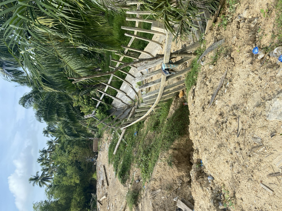 The scene depicts an outdoor environment in Seuneubok Teungoh, Indonesia, under a partly cloudy sky. In the foreground and mid-ground, light brown, sandy earth is present, characterized by uneven terrain, including a notable depression or excavation on the left. Scattered debris, including fragments of wood and multiple clear plastic water bottles, some with blue caps, are visible across the soil. Dominating the mid-ground on the right is a large, unfinished or dilapidated wooden boat frame, angled upwards from right to left. The frame consists of numerous vertical wooden ribs and some horizontal planking forming the hull structure. A piece of plaid cloth, featuring blue, white, and brown patterns, hangs from one of the frame's uprights. Green grass and other small plants grow on the slopes beneath and around the boat frame. In the background and extending along the right side, dense tropical vegetation is prominent, featuring numerous tall palm trees with visible trunks and large fronds, interspersed with other green foliage. In the distant left background, a cleared area with scattered debris is visible, along with a small, light-colored wooden bench-like structure. No individuals are present or engaged in any activity. The lighting suggests daytime conditions.