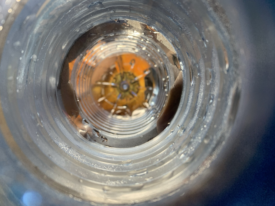 The image displays a forensic, direct overhead view looking into the opening of a clear plastic bottle. The bottle's interior walls exhibit concentric ridges and multiple small water droplets, indicating residual moisture. At the bottle's base, a blurred orange-yellow object is visible, partially covered by a central, metallic-silver component featuring radial spokes or ribs. A human hand, or portions of a hand, is partially visible through the translucent plastic on the exterior of the bottle, positioned along its lower left circumference. The immediate background surrounding the bottle's opening is out of focus, revealing a dark blue surface on the lower left and bright, sunlit reflections on the upper right. The image contains no specific visual cues to identify its location as Jos, Nigeria.