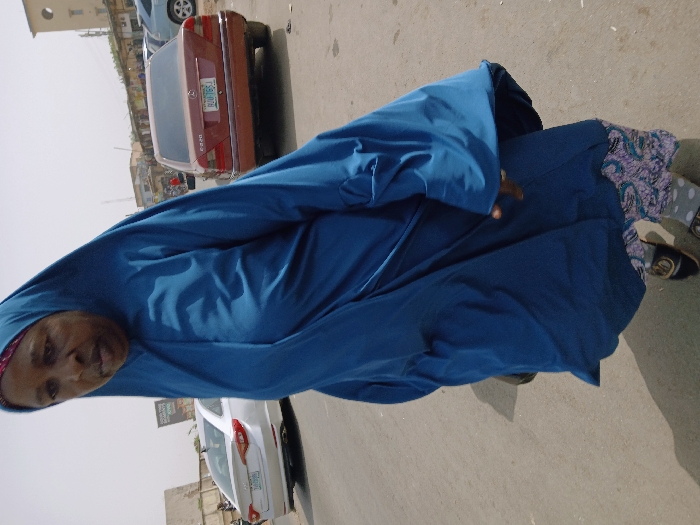 An urban street scene is depicted during daytime under a bright, hazy sky. A lone individual, dressed in a blue hijab and a long, flowing blue outer garment over patterned trousers and open-toed sandals, walks forward on an asphalt road. A distinct, elongated shadow is cast to their left. In the background, a white Hyundai Sonata and a red Mercedes-Benz C220 are parked along the street. The Mercedes-Benz displays a Nigerian license plate, 'KJD-765J'. Distant buildings, including multi-story structures, and a partially visible billboard are present. The scene is described as occurring in the city of Masvingo, Zimbabwe.