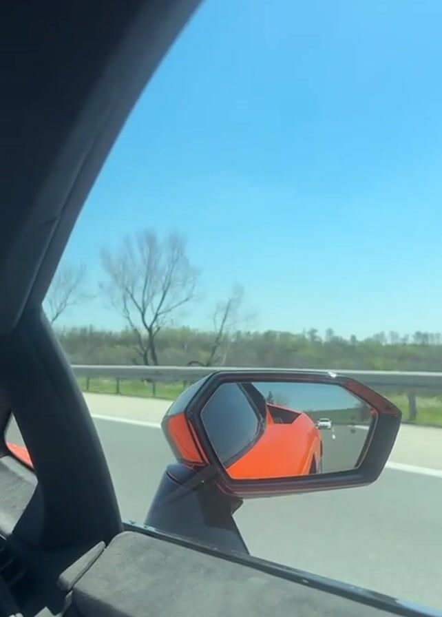 From the interior of a car, we see the orange car directly behind, in the driver's side mirror. The exterior is mostly green, with bare trees lining the road. The sky is a clear blue. The view is taken from the driver's side rear window. Both cars appear to be traveling on a divided highway.