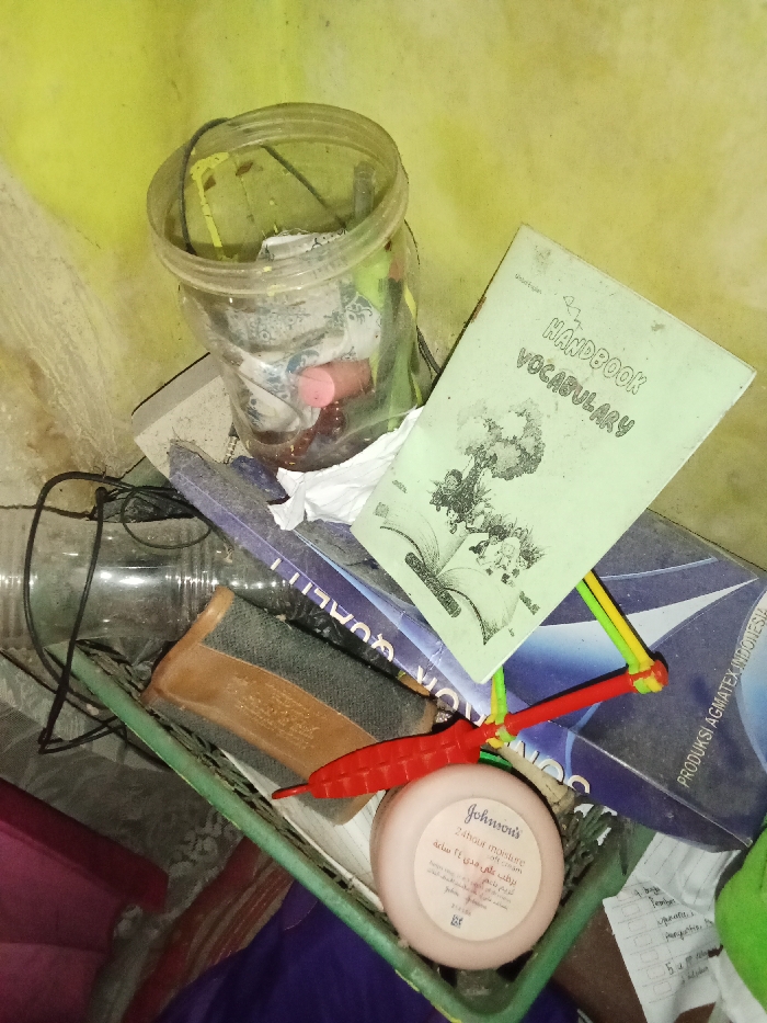 The image displays a collection of miscellaneous household items situated in a corner against a light yellow-green wall in Ciputri, Indonesia