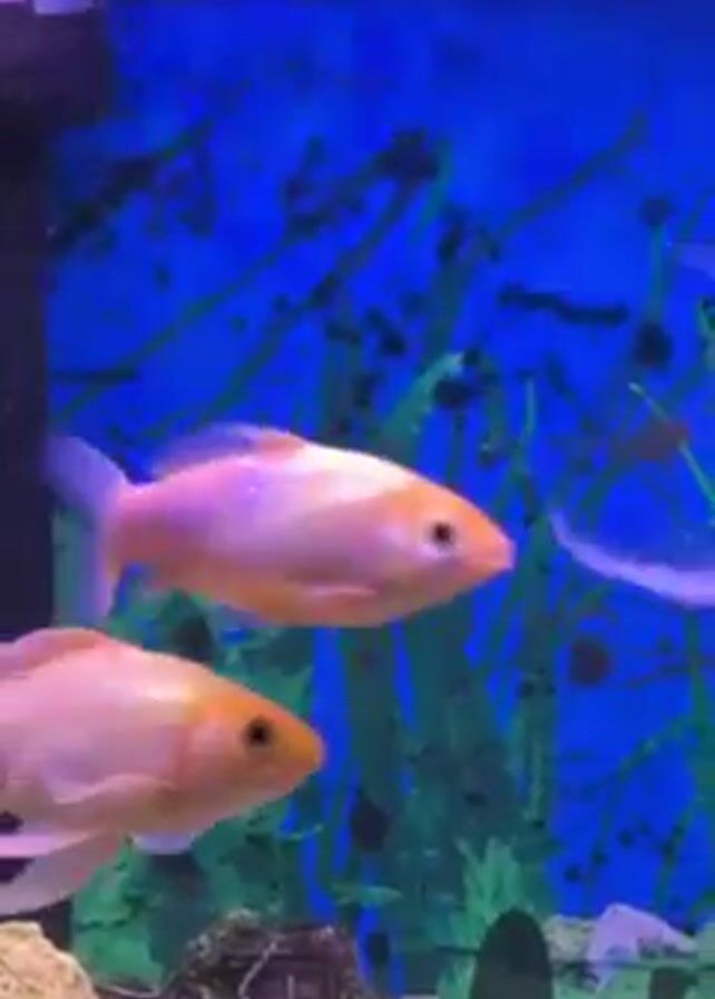 several orange goldfish swimming in an aquarium. The background is a bright blue with green artificial plants. There are also some decorative items on the bottom of the tank. The fish are moving gently through the water.