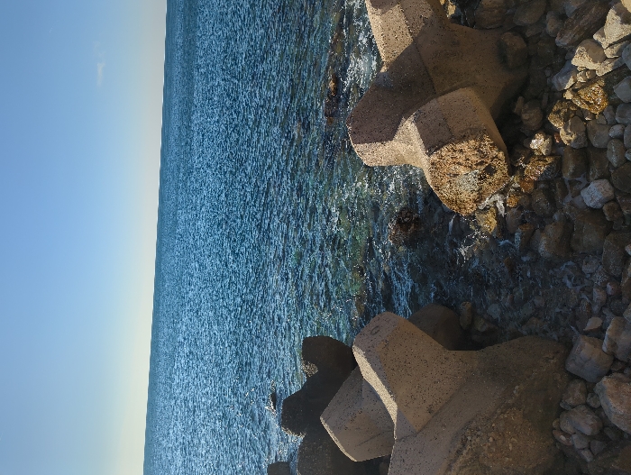 The scene depicts a coastal area in Perazića Do, Montenegro. In the immediate foreground, a rocky shoreline is visible, composed of various sizes of weathered stones and pebbles. Several large, light-colored concrete tetrapods, designed as breakwater structures, are positioned on and partially submerged in the water along the shore. One prominent tetrapod is on the left, largely intact, and another is on the right, partially visible and angled. The clear, blue-green sea extends from the rocky edge into the midground and background, showing visible ripples and sunlight reflections on its surface. Near the shore, the water is transparent enough to reveal submerged rocks. The horizon line separates the sea from a clear, light blue sky with minimal cloud cover, save for a small, faint white cloud in the upper right quadrant. No individuals or specific actions are observed.