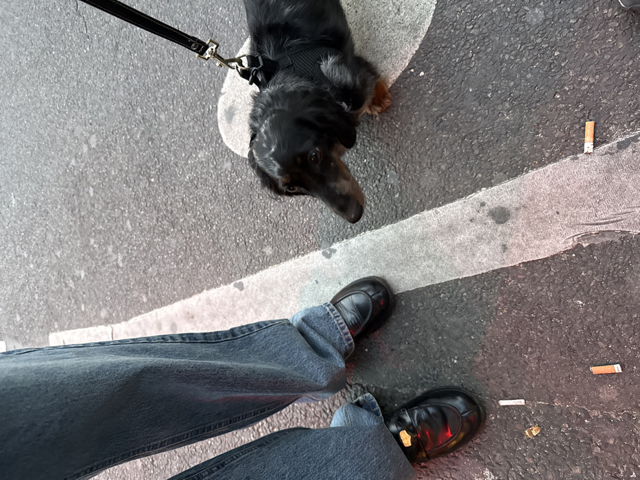 The image depicts a ground-level view on a paved surface in Paris, France. The lower legs of an individual are visible on the left, wearing blue denim jeans and black loafers. The left loafer features a gold-colored rectangular adornment. To the right, a long-haired black and tan dachshund, wearing a black harness with a black leash attached, stands on a dark gray asphalt surface. The dog is positioned to the right of a faded white painted line that runs vertically through the frame, and its head is turned towards the left, facing the individual's feet. Several white and orange-filtered cigarette butts are scattered on the asphalt, primarily near the individual's feet to the left of the white line. Small fragments of debris are also visible on the ground.