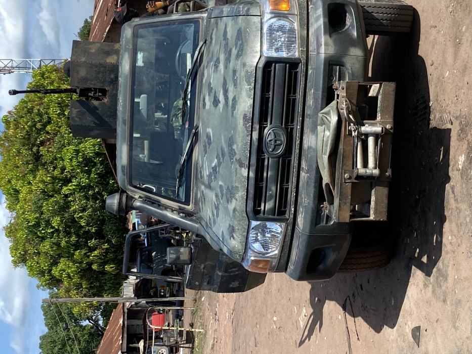 - "An olive green and dark brown camouflage-painted, military-modified Toyota Land Cruiser (70 series) occupies the foreground, positioned on a reddish-brown dirt road under a partially cloudy sky" by FM-Ff9pr2, licensed under CC BY 4.0