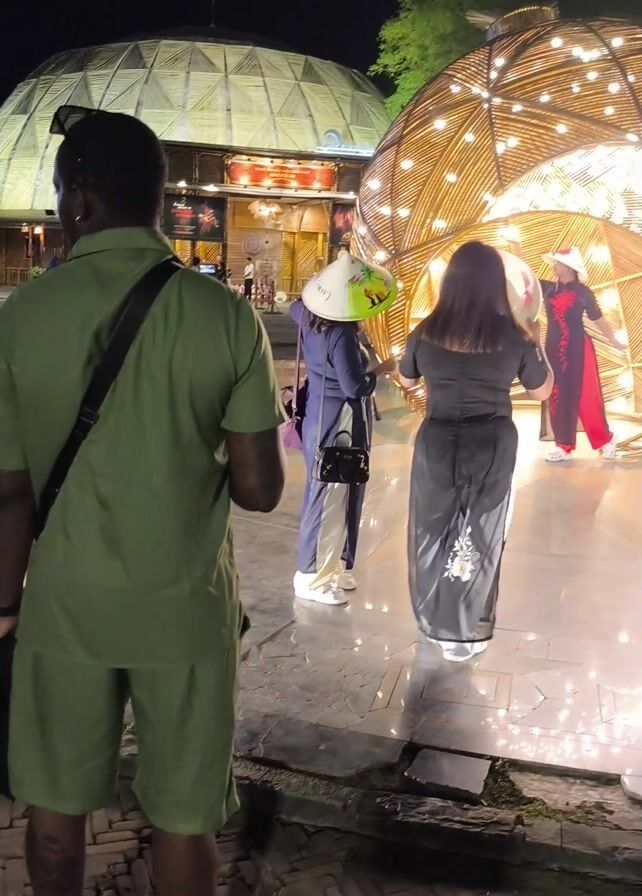 nighttime scene in what appears to be a public space, with a man in the foreground wearing a green shirt and shorts, facing away from the camera. He has a black bag slung across his shoulder. In front of him, two women are standing and looking towards a large, illuminated, spherical structure made of woven material, possibly bamboo. One woman is wearing a dark-colored dress and the other is wearing a blue outfit and a traditional conical hat. Inside the spherical structure, another woman dressed in a traditional red and black outfit, possibly an Ao Dai, is posing. The area is paved with brick and stone. In the background, there is a building with a dome-shaped roof. The overall atmosphere is that of a cultural or tourist attraction.