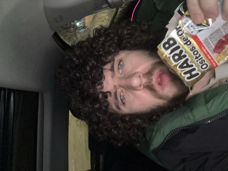 An adult male with curly dark hair, blue eyes, and a full beard is seated inside a vehicle, identified as being in Pushkino, Russia. He is facing the camera directly, with his mouth slightly open. He wears a dark green puffer jacket over a lighter-colored garment. The subject holds a partially open package of "HARIBO Ositos de Oro" gummy candies in his left hand, revealing red and yellow candies. The vehicle interior is dimly lit, with portions of the headliner and a window visible. Blurred light sources and reflections in the background suggest an outdoor nighttime environment. A faint pink light is visible to the right of the subject's head.