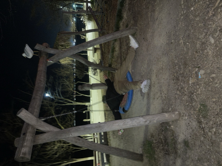 The image depicts a nighttime scene in the Sea Garden (Morska Gradina) of Varna, Bulgaria, specifically a playground area near the coastline. A rustic wooden swing set, constructed from large debarked logs forming A-frames and a horizontal crossbeam, occupies the foreground. A white, realistic-looking seagull figurine is perched on the crossbeam. A single individual is positioned supine on a large, circular "nest" swing with a blue rim and black mesh center, suspended from the wooden frame. The person is wearing a dark jacket and light brown trousers, with white sneakers on both feet. Their arms are outstretched to the sides, and legs are extended, one slightly bent. A silver-colored beverage can with red and green markings is visible on the swing near the person's left hip. The ground beneath the swing set is dirt or packed earth with minimal vegetation and scattered debris. In the background, a paved promenade runs along a body of water, likely the Black Sea, with distant artificial lights visible across the water. Bare-branched trees line the promenade, suggesting a non-summer season. The scene is illuminated by artificial light sources, including a bright light fixture positioned behind the swing set. Other park benches and structures are partially visible in the dimly lit background.