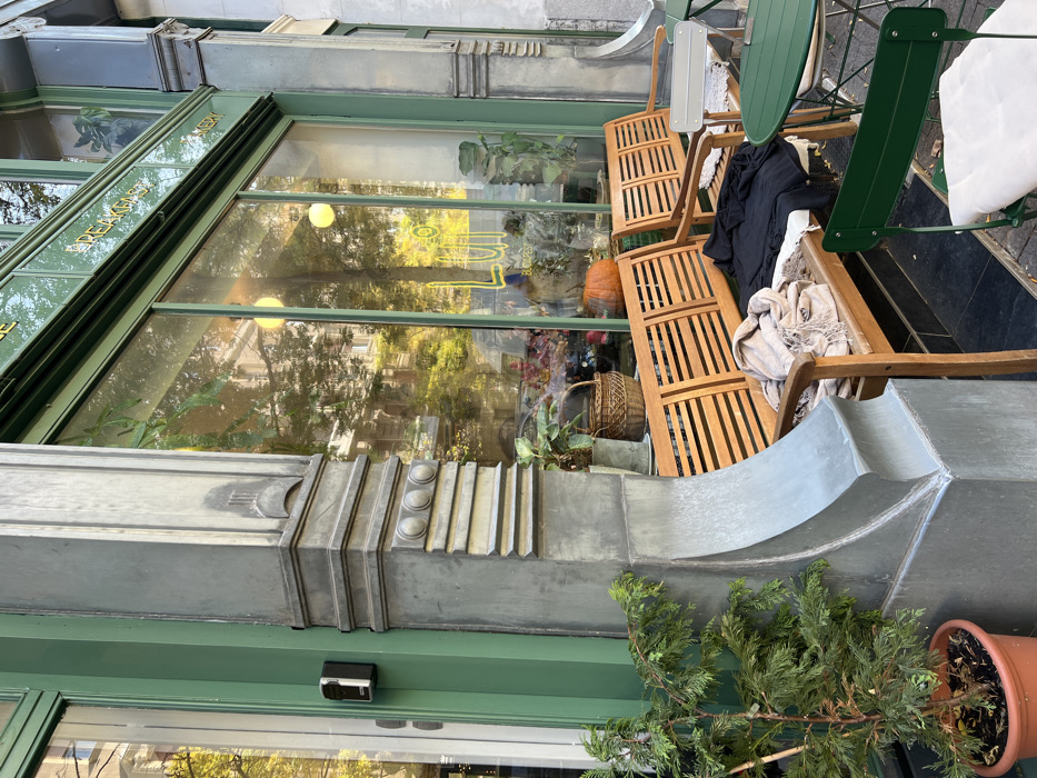 The image displays the exterior of LUI Budapest (Breakfast & Bakery) located at Sas utca 12, 1051 Budapest, Hungary. The scene captures an outdoor seating area adjacent to a green-painted storefront with large glass windows. A tall evergreen plant in a terracotta pot is positioned on the left. To its right stands a prominent, ornate grey architectural pillar, featuring decorative vertical fluting, horizontal bands, and three circular protrusions. A black wall-mounted access control device is visible on the green frame to the left of this pillar. The storefront windows reflect trees and portions of an opposing building. Inside the window display, an orange pumpkin, several potted plants (one in a woven basket), and various unidentifiable items are present. A yellow neon sign reading "LUI Budapest" is visible through the reflections. Above the windows, the green facade bears white lettering spelling "BREAKFAST BAKERY." Two empty wooden slatted benches are arranged on a dark-tiled surface in front of the windows. The front bench contains a folded beige blanket or scarf and a black fabric item. To the right, a dark green round metal table and a matching metal chair with a light-colored cushion are visible. No individuals are present in the depicted area.