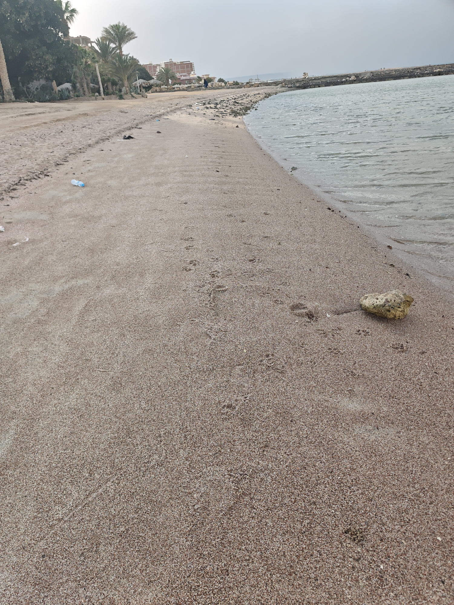 The image depicts a sandy beach along a body of water in Al Ahia', Egypt, under an overcast sky. The foreground shows reddish-brown coarse sand with numerous animal paw prints, primarily leading towards the water. A pale, irregularly shaped rock or piece of coral rests on the sand near the waterline, to the right. Scattered debris on the sand includes a discarded plastic water bottle, several small pieces of white plastic or paper, and other dark fragments. The water, appearing light green-blue, exhibits small ripples and recedes into the distance along a curved shoreline. A long, dark rocky breakwater or barrier extends into the water in the midground. Along the landward side of the beach, a dense line of green vegetation, predominantly palm trees, is visible. Behind the foliage, multiple multi-story buildings with light and reddish-brown facades are present. Small thatched beach umbrellas are interspersed among the trees. A lone human figure, dressed in dark attire, is visible walking in the distance along the upper beach or a parallel path.