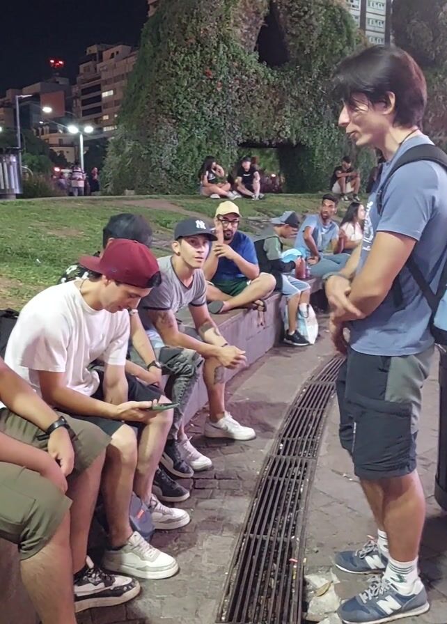 A group of about ten young men are sitting next to each other on the edge of a street, at night, with their legs extended. Some are looking at phones, others are talking and gesturing. One man is standing and looking down at the group. There is a large hedge shaped like a letter behind them, a street light, and a building with a brightly lit billboard.
