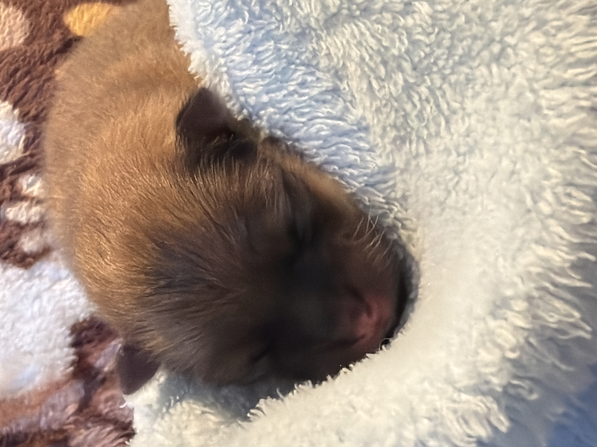 - "A newborn brown puppy sleeps curled up in a fluffy white blanket" by FM-HG5o13, licensed under CC BY 4.0