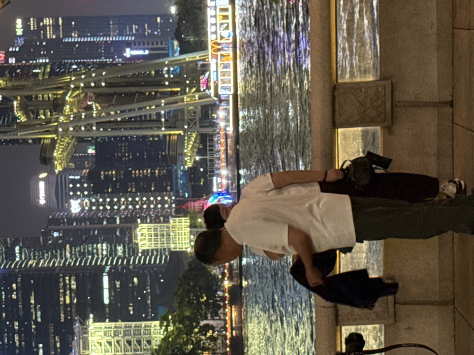 The image displays a nighttime scene along the Pearl River in Haizhu District, Guangzhou, China. Two individuals stand on a paved riverside promenade, viewed from behind, positioned in front of a stone barrier. The person on the left wears a white short-sleeved shirt and dark trousers, holding a dark garment. The person on the right, partially obscured, wears a light-colored short-sleeved top and dark lower garments, holding a small dark handbag and another dark object. To the far left, a camera on a tripod is partially visible. The Pearl River occupies the midground, reflecting ambient city lights. An illuminated boat, featuring a prominent McDonald's logo, is visible on the river. The background consists of a dense, brightly lit urban skyline across the river, dominated by numerous skyscrapers and the illuminated Canton Tower.