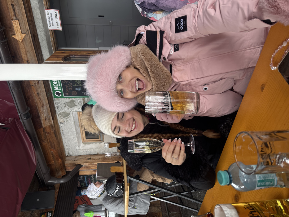 two women seated at a wooden table within an outdoor or semi-outdoor dining area in St. Christoph, Austria, likely at a ski resort establishment. The woman on the left, with dark hair and wearing a white knit beanie with a beige pompom and a black winter jacket, smiles while holding a flute glass containing a sparkling beverage. The woman on the right, with lighter hair, wears a prominent pink fluffy hat, a brown fleece neck warmer, and a pink winter jacket with a "DOPE" brand patch on the left sleeve. She is holding a large glass beer stein filled with a light-colored beer, her mouth open in an expressive manner. On the wooden table in the foreground, a plastic water bottle with a blue cap and several empty or partially filled glasses are present, including a tall beer glass with a visible head. In the background, another individual in a grey jacket and a light-colored head covering is seated at a different table to the left. The architectural elements include a rough stone wall, exposed wooden beams, and a dark red awning. Visible signs include a green "MOHREN" logo, a chalkboard menu listing "Aperol 8,50," a white sign on a grey door that reads "Zutritt nur für Mitarbeiter! STAFF ONLY," and a wooden arrow pointing right with "WC / TOILETTEN" indicated.