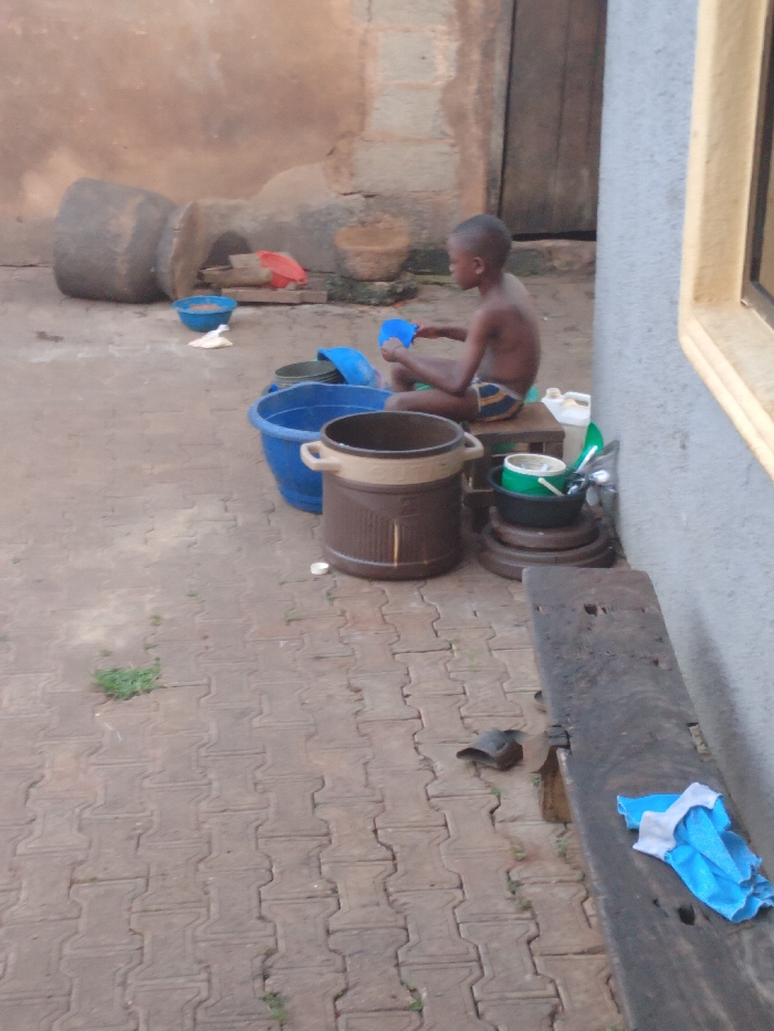 The image portrays an outdoor domestic scene in Ejule, Nigeria, with a young, shirtless male individual seated on a low wooden stool on a paved surface of interlocking bricks