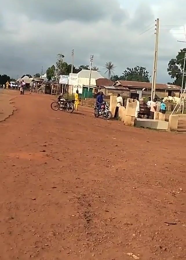 dirt road in what appears to be a rural area. The road is unpaved, with a reddish-brown hue. Several people are gathered near a concrete structure, possibly a bus stop or a small gathering point. Some individuals are sitting, while others are standing or walking. A couple of motorcycles are parked nearby. The buildings in the background are simple structures, some with signs, indicating small businesses or shops. The sky is overcast, and a few utility poles are visible, along with trees, completing the scene of a quiet, likely slow-paced setting. Construction scaffolding can be seen as well.