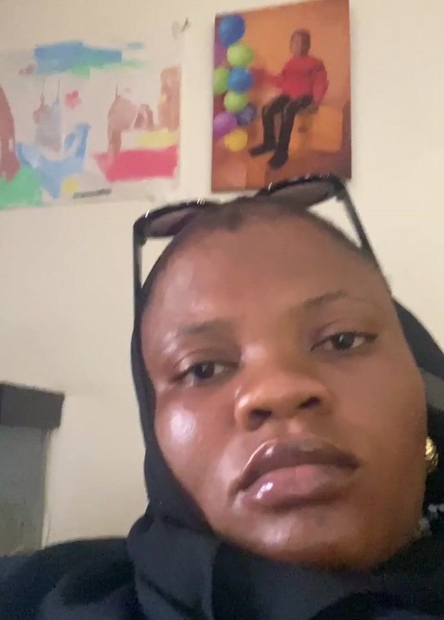 A close-up video focuses on a woman. She has dark skin, full lips with a glossy finish, and wears sunglasses pushed up on her head. She is draped in a black garment, possibly a hijab or scarf. The background is an indoor setting, likely a room in a house, featuring two pictures on the wall. One appears to be a child's artwork with abstract shapes and colors, while the other is a photograph of a child sitting on a piece of furniture, surrounded by balloons. The woman looks directly at the camera. The camera angle remains steady throughout.