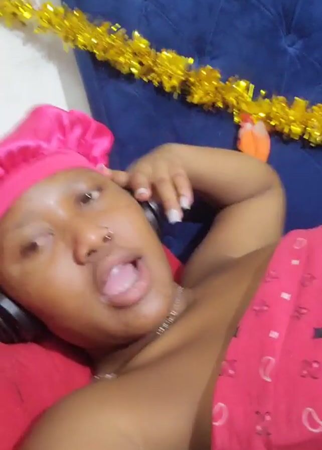 A woman wearing a pink bonnet and a silver necklace is lying on a bed. She is mostly covered by a pink cloth with paisley patterns. Her right hand is resting on her head, while her left hand is resting on the cloth covering her. She briefly sticks out her tongue. A gold tinsel garland is draped across the blue headboard of the bed. A green pillow is visible near her waist.