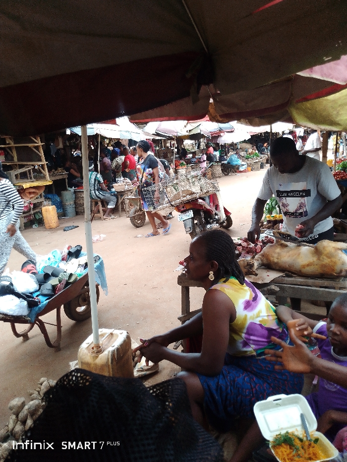 A busy market scene unfolds under makeshift awnings. A woman sits in the foreground, wearing a colorful top and blue skirt, next to a child and a styrofoam container of food. To the left, a wheelbarrow displays shoes. A butcher in a gray t-shirt prepares meat on a table with a skinned animal carcass. People browse various stalls with vegetables, clothing, and other goods. A motorcycle with cages attached is parked nearby.