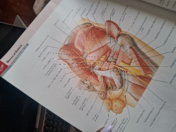 An anatomical textbook page, titled "Nerves of Buttock," is prominently displayed, tilted diagonally from bottom left to top right