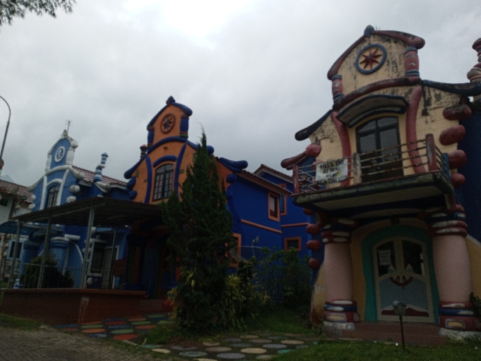 Three whimsical, vividly colored houses stand under a cloudy sky. The left house is primarily blue with a clock tower. The middle building showcases orange and blue hues, partially obscured by a tall evergreen. The rightmost house is painted in a mix of yellow, pink, and red, with a balcony and rounded columns. The ground is covered with patterned stones leading up to the houses, surrounded by grass and shrubbery.