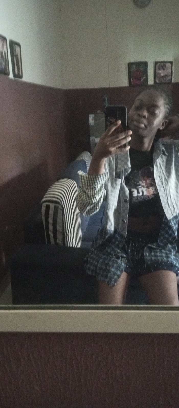 The image depicts a mirror selfie taken indoors, appearing to be within a residential setting in Abuja, Nigeria. A single individual, a young adult female with dark skin and dark braided hair, is visible from the waist up, reflected in a mirror. She holds a black smartphone in her right hand, positioned to capture the reflection. Her expression is a slight smile. She is wearing a dark t-shirt with partial white text, an unbuttoned light-colored long-sleeved shirt over it, and dark, patterned shorts. Behind the individual, in the reflection, a sofa or armchair is visible. This furniture item features a dark blue base and a cushion with vertical black and white stripes. The wall in the background is painted in two horizontal sections: a lighter, off-white upper section and a darker, reddish-brown lower section. Four dark-framed pictures are mounted on the wall; two are partially visible to the upper left, and two are positioned to the upper right, above the individual's head. The bottom edge of the mirror is indicated by a light-colored horizontal frame element spanning the lower portion of the image. The ambient lighting appears moderate, contributing to a slightly grainy texture in the image.