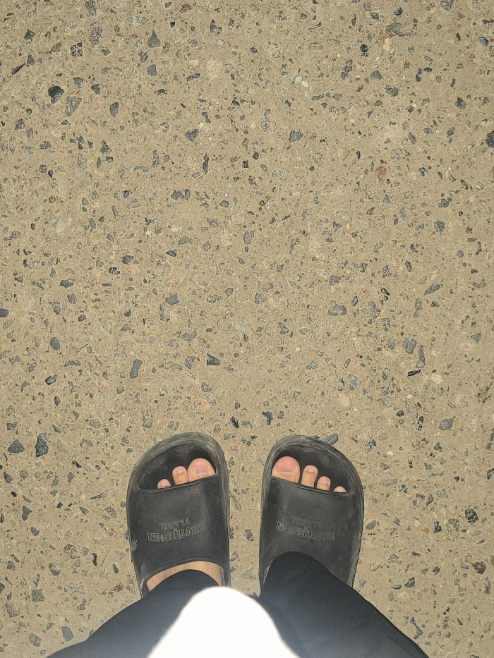 The image displays a top-down view of a person's feet, clad in dark-colored slide sandals, standing on a light brown exposed aggregate concrete surface
