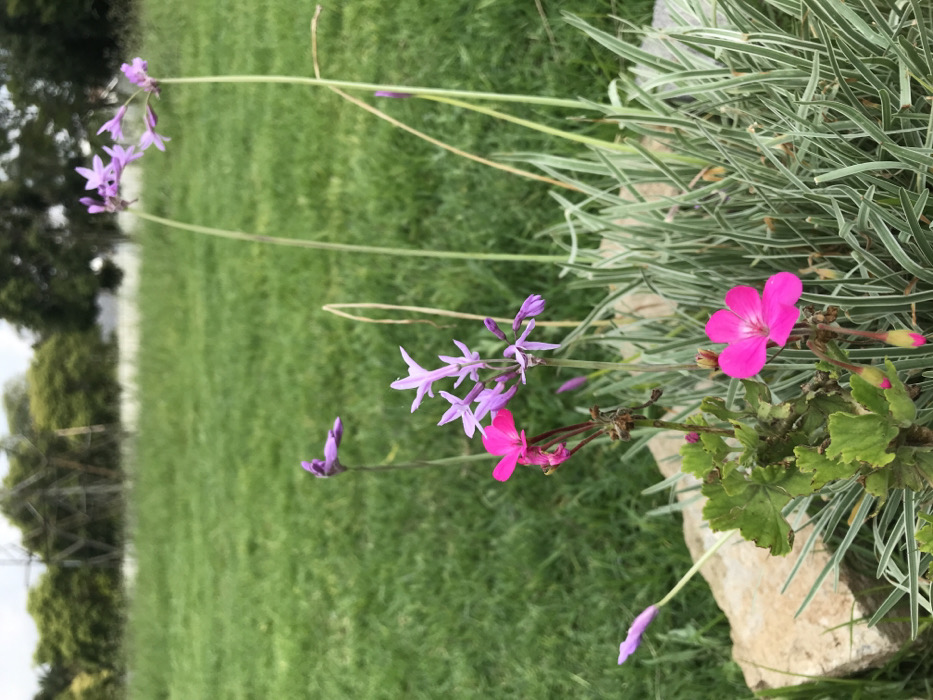 The image displays a detailed view of flora in the foreground with an expansive natural landscape behind, located in Germiston, South Africa. In the immediate foreground, an irregular light-colored rock rests on short green grass. Adjacent to the rock, a plant features bright pink five-petaled flowers, with one fully open bloom and two closed buds, accompanied by stems exhibiting areas of browning. To its right, several slender stalks rise, bearing clusters of small, star-shaped, light purple flowers and additional unopened buds. A clump of variegated green and white striped grass-like plants is positioned behind these flowers. The midground consists of a wide expanse of uniformly green, short-cropped grass. The background shows a line of green trees, largely obscured by a prominent, metallic lattice power transmission pylon. The sky overhead is overcast.