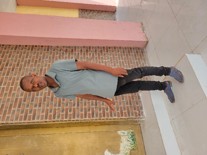 An adult male stands on a white tiled step within a semi-sheltered area in Ebenebe, Nigeria