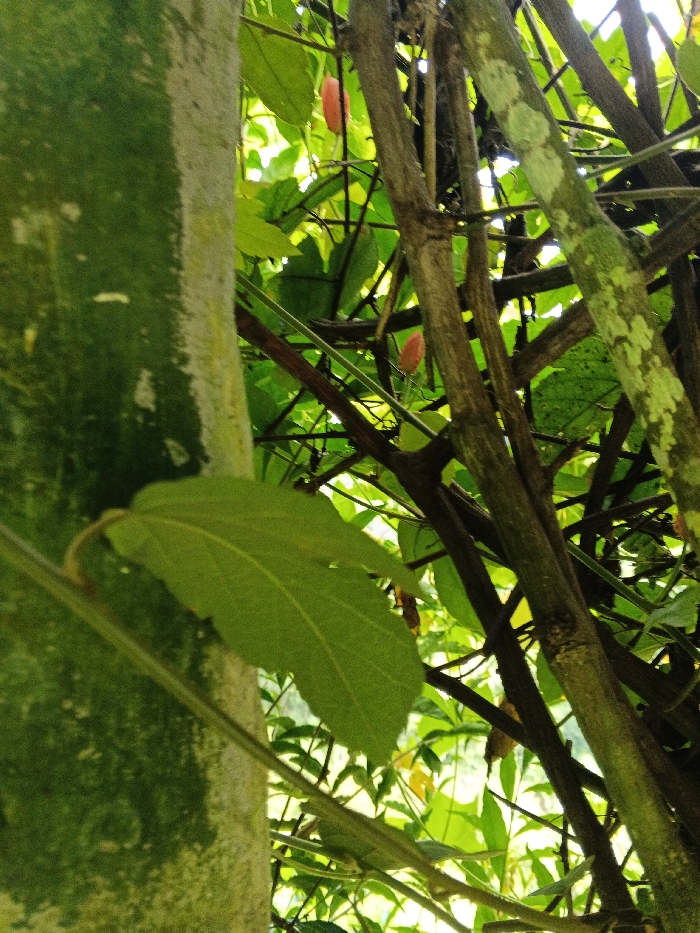 The scene depicts a dense vegetative area in Masulog, Philippines. The foreground features the left side of a thick, light green tree trunk, textured with vertical striations and lighter, possibly moss-covered, patches. A single, broad green leaf extends from the left mid-section, partially obscuring the trunk. To the right, a network of thinner, darker brown and green branches and vines forms a dense thicket. Amidst this foliage, two small, elongated, reddish-orange fruits are visible, one in the upper-mid section and another below it. Bright, diffused daylight filters through the overhead canopy, illuminating the numerous green leaves and creating a dappled effect throughout the background. No individuals or man-made objects are present.