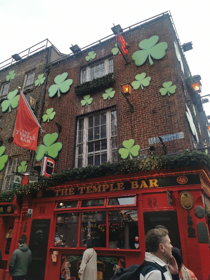 The image depicts the exterior of "The Temple Bar" pub located at 48 Temple Bar Street, in the Temple Bar area of Dublin, Ireland