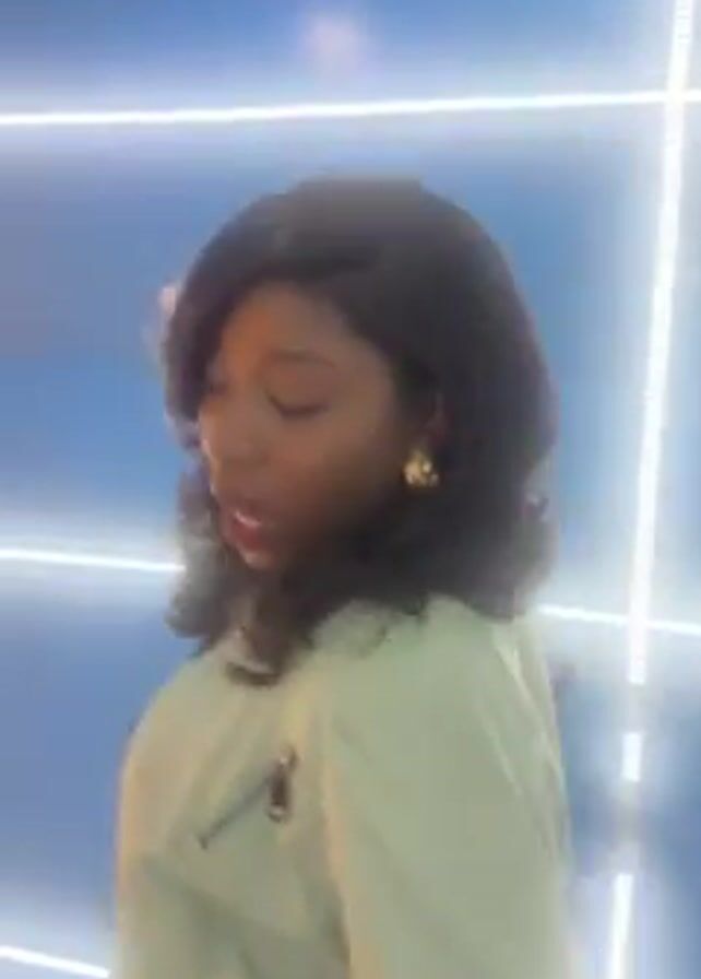 A woman with dark curly hair, a light green jacket, and gold flower earrings poses and dances in front of a wall covered with blue panels and crisscrossing white and orange lights. She smiles and moves her head, sometimes looking at the camera and sometimes away.